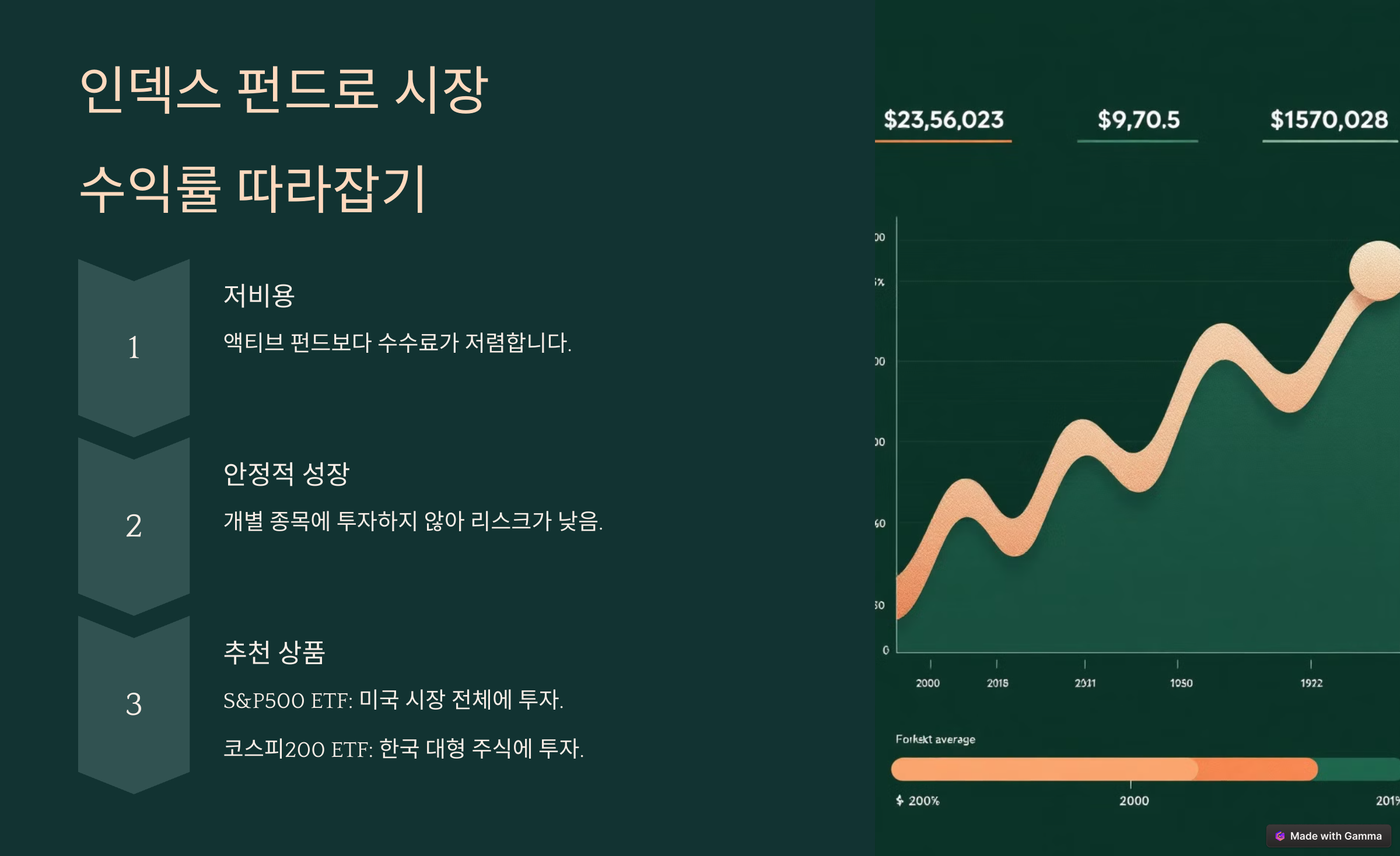 인덱스 펀드는 시장의 특정 지수를 추종하는 투자 상품으로, 관리 비용이 낮고 시장 평균 수익률을 안정적으로 따라갑니다.